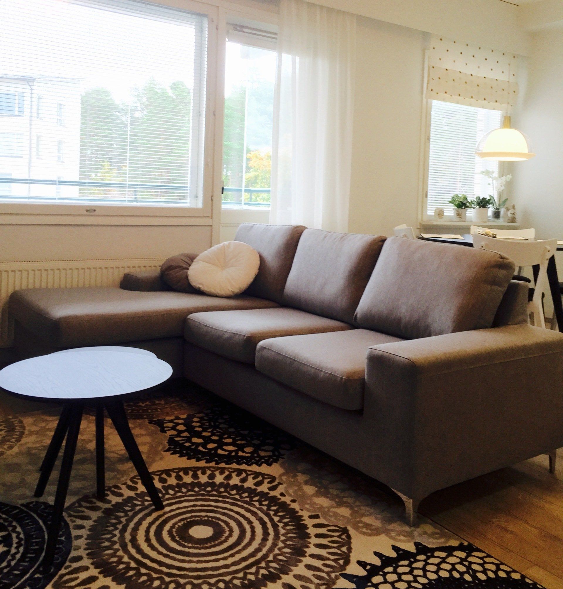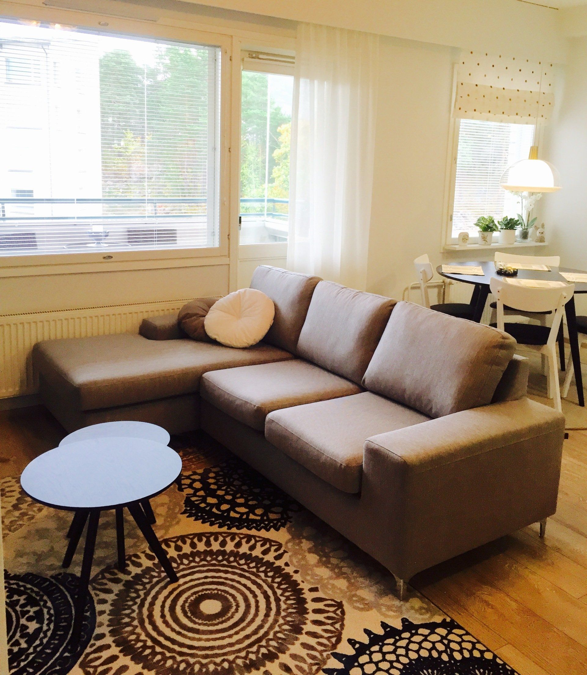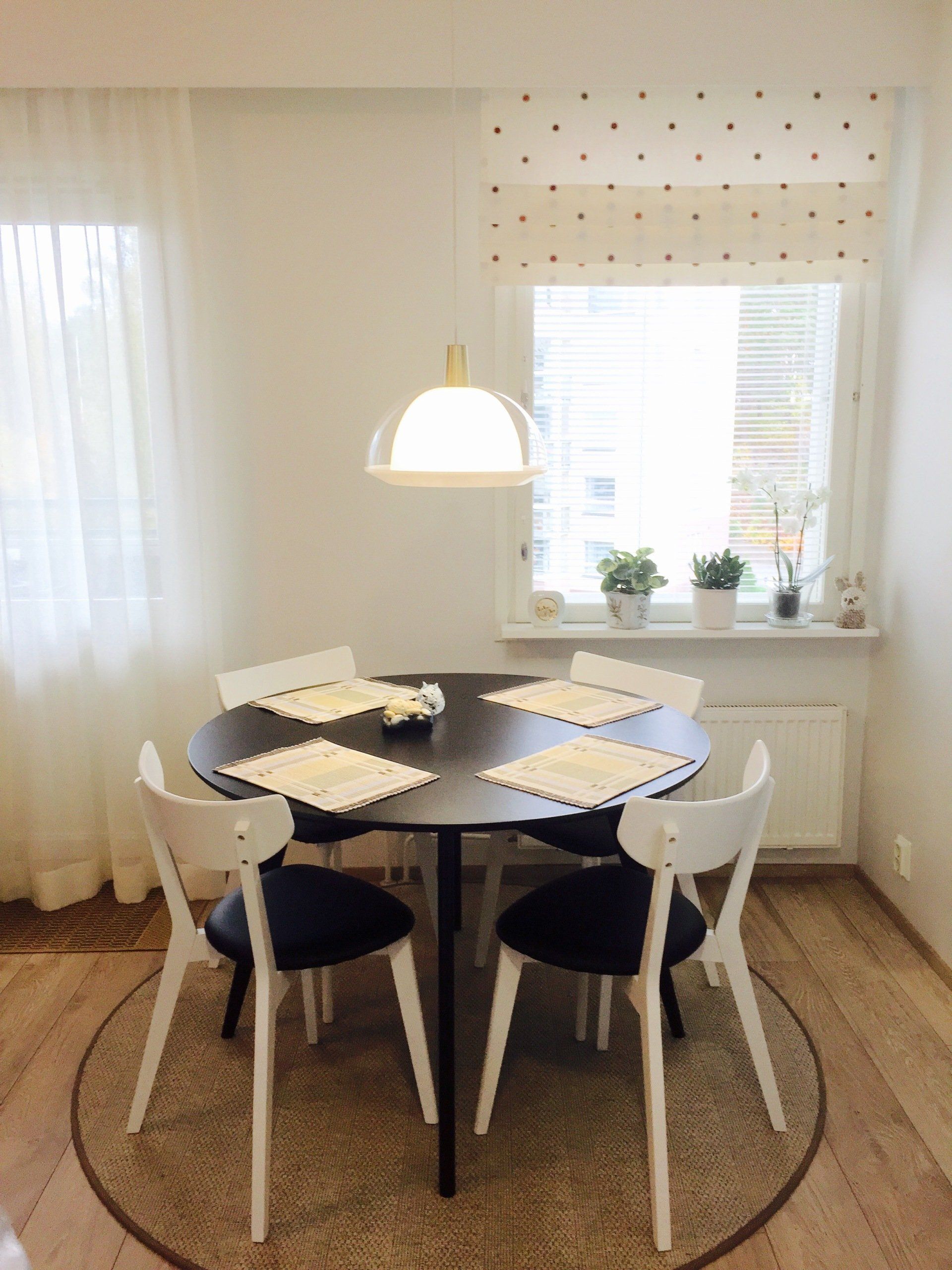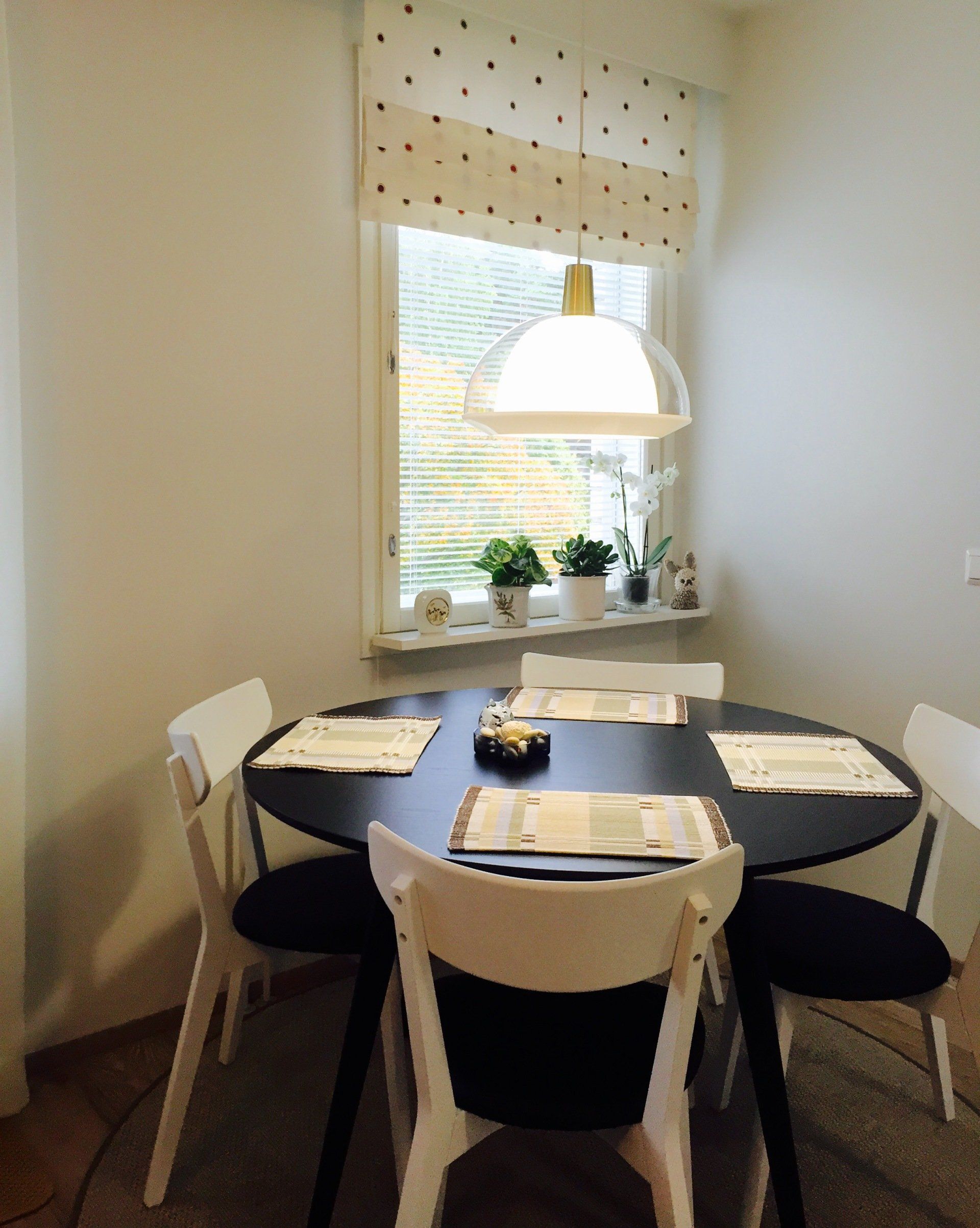 Tässä pienessä kerrostalokodissa uudistettiin pinta- ja keittiöremontin jälkeen kaikki tekstiilit, huonekalut sekä valaistus. Toiveena oli rauhallinen sisutus ripauksella mustaa ja väriä. Tekstiilien teemana pallokuosi, joka toistuu sekä keittiön verhossa että olohuoneen aivan ihanassa matossa.