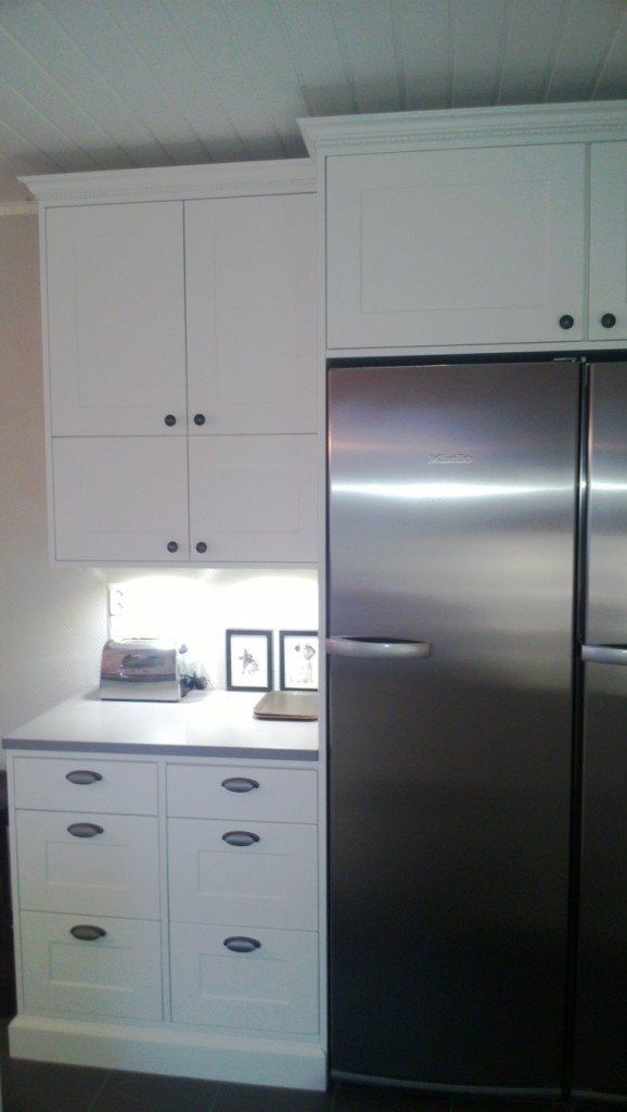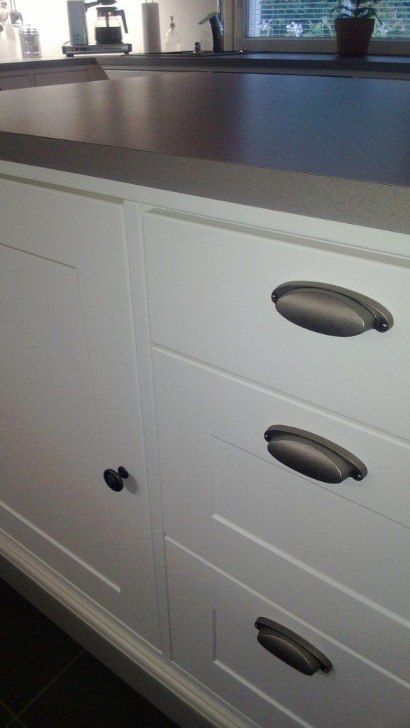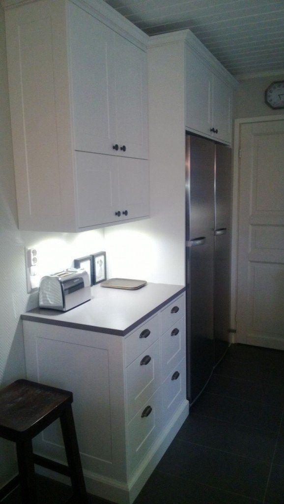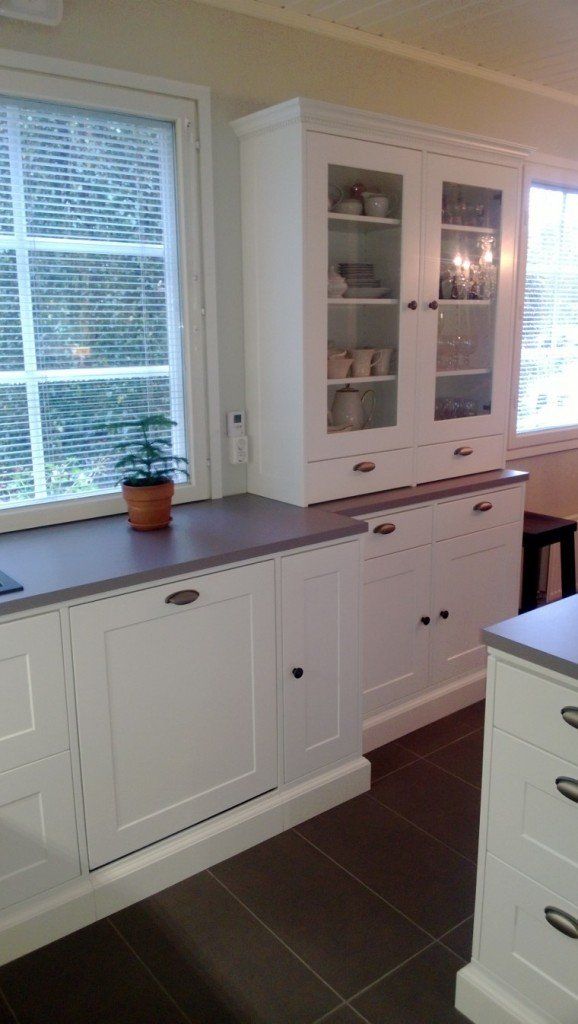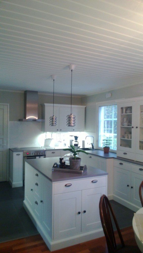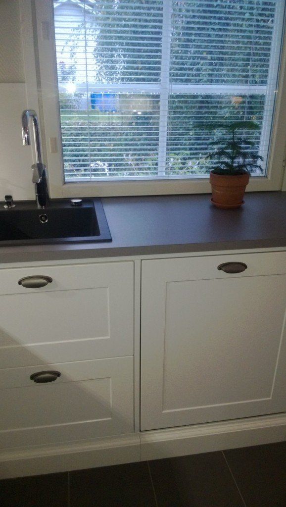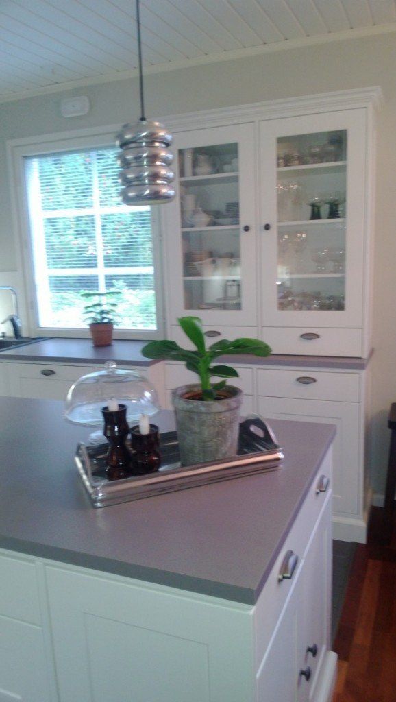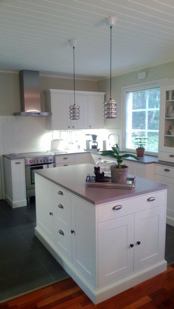 Omakotitalon keittiöuudistus, Turku. Keittiöuudistuksessa asiakas kaipasi apua kaapistojen, vetimien, tason, välitilan ja lattian sävyjen sekä pintamateriaalien suhteen, jotta kokonaisuus olisi hillitty, ehdottomasti helmeenharmaalla terästetty ja englantilaistyylinen.