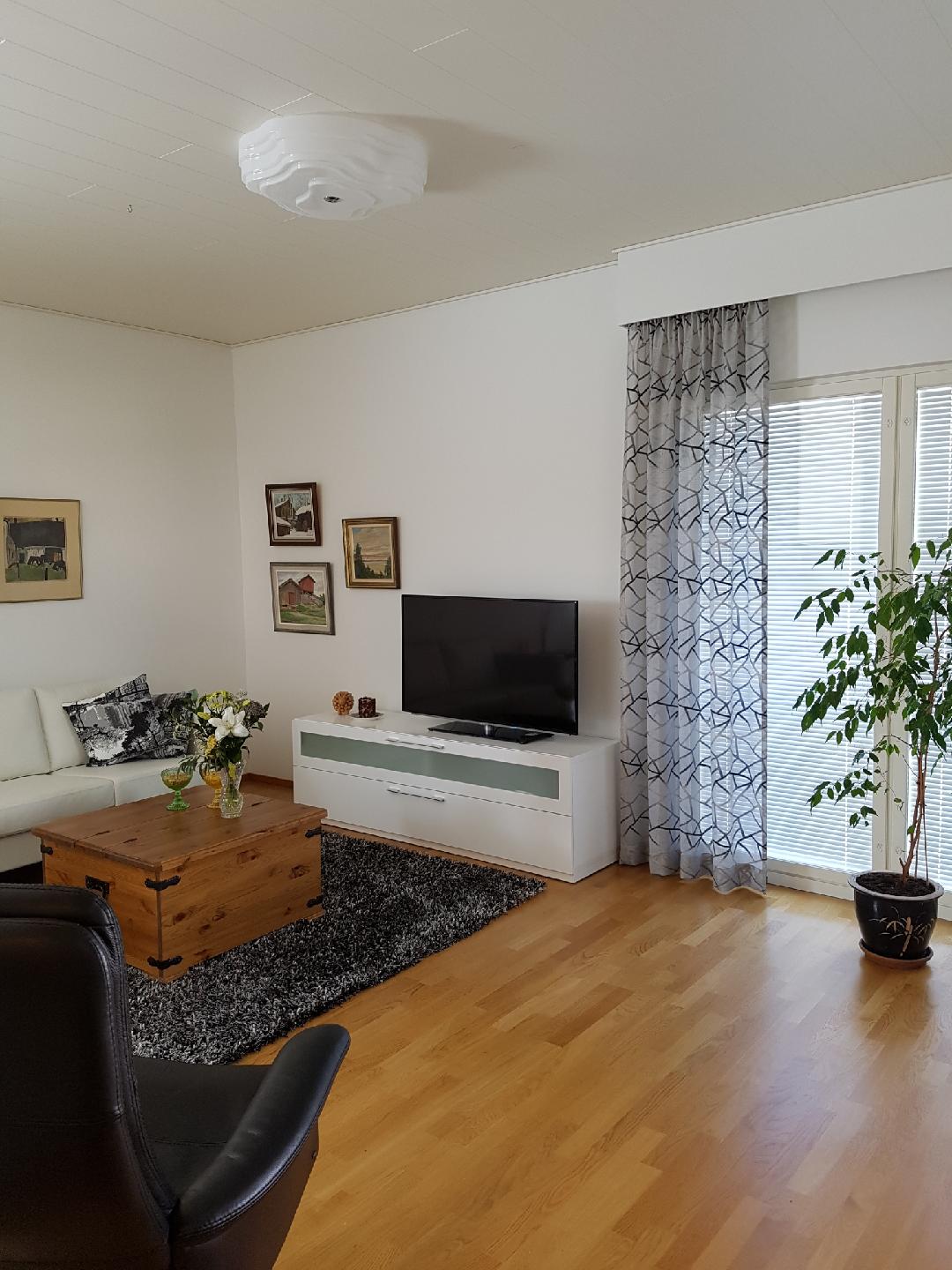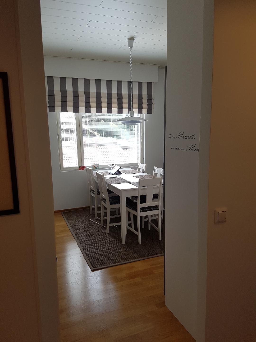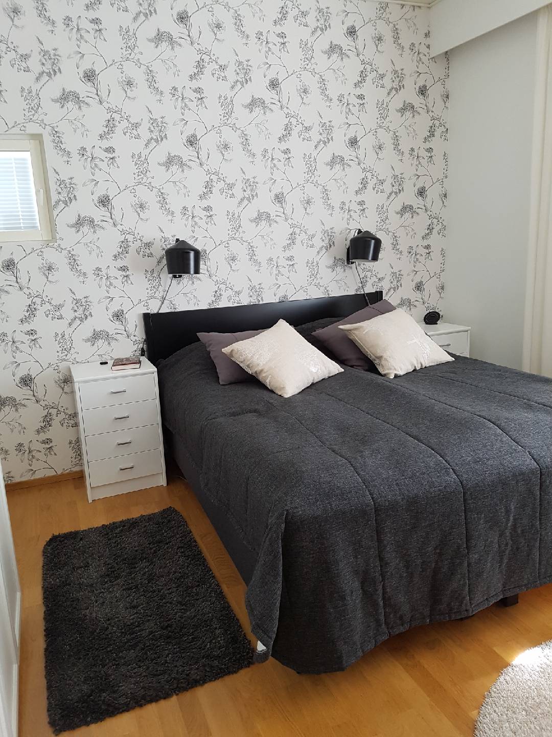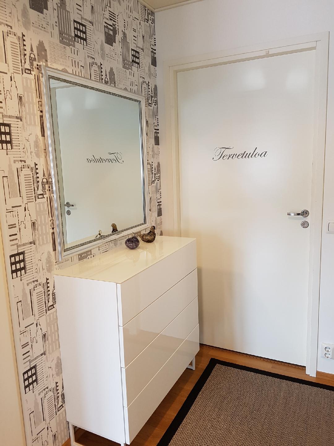 Tässä kodissa uudistettiin kaikki seinäpinnat. Seinät maalattiin vaaleiksi ja lisäksi eteinen, makuuhuone ja vierashuone saivat uuden raikkaan tapetin. Kaikkiin huoneisiin teetettiin uudet verhot. Makuuhuoneeseen hankittiin ihanat mustat Pasila-seinävalaisimet lukuvaloiksi ja olohuoneen kattoon hyvin valaiseva ja tyylikäs Laguna-valaisin, molemmat Innoluxin mallistosta. Eteisen ja vierashuoneen osalta uusittiin myös kalusteita. Jotta yhtenäisyys tilojen välillä säilyi niin sävymaailmassa säilytettiin asiakkaita miellyttäviä harmaan ja mustan sävyjä.