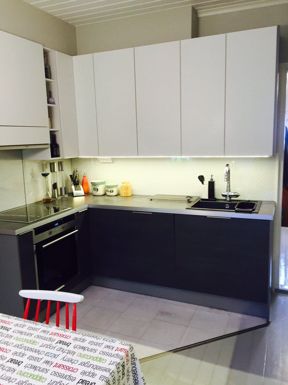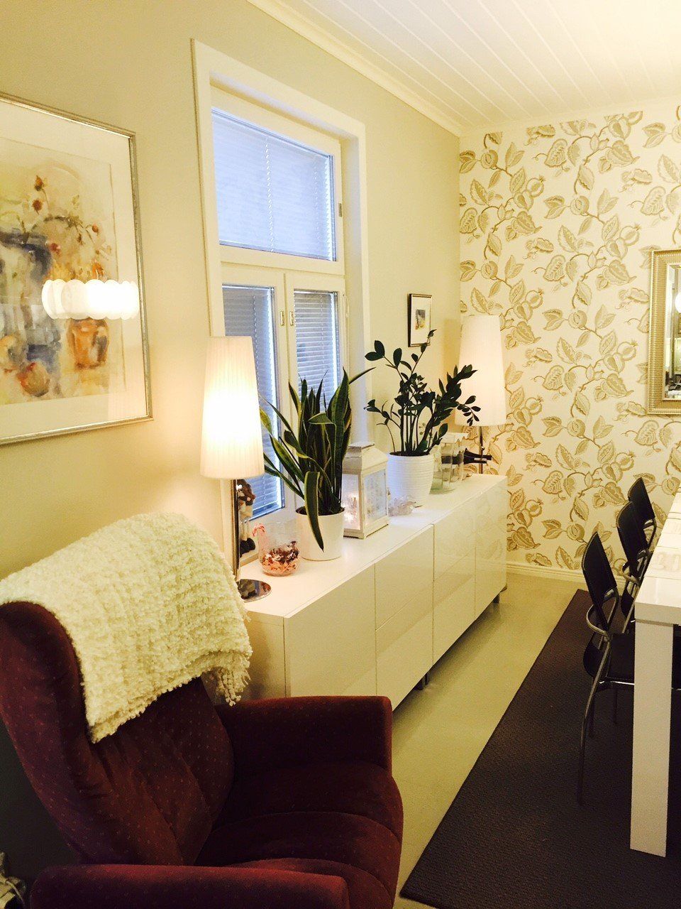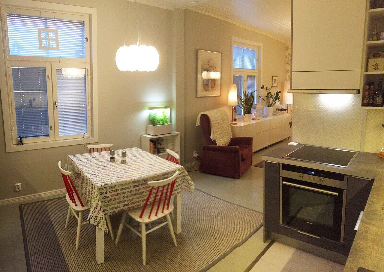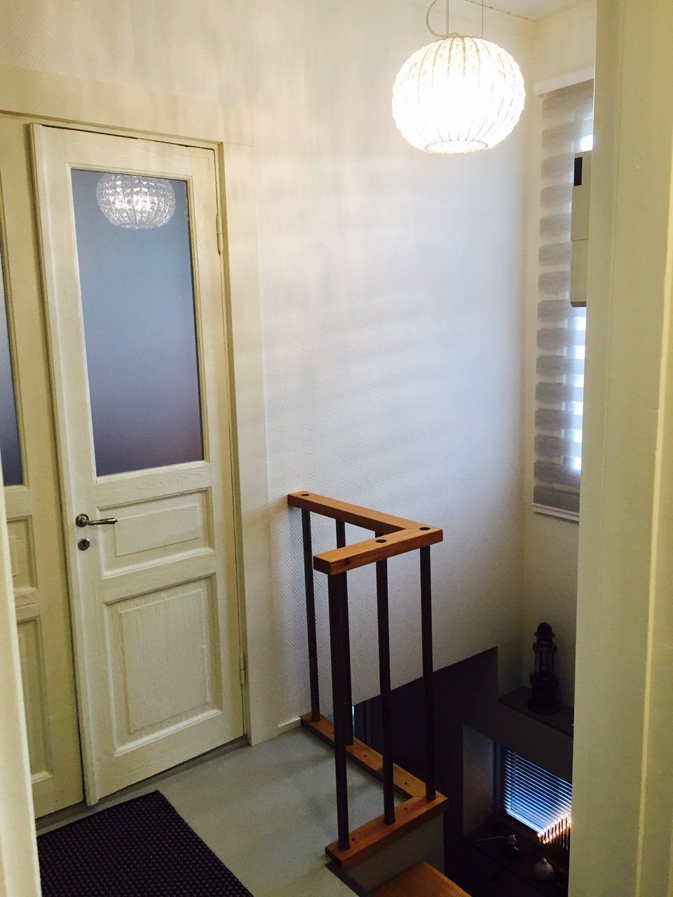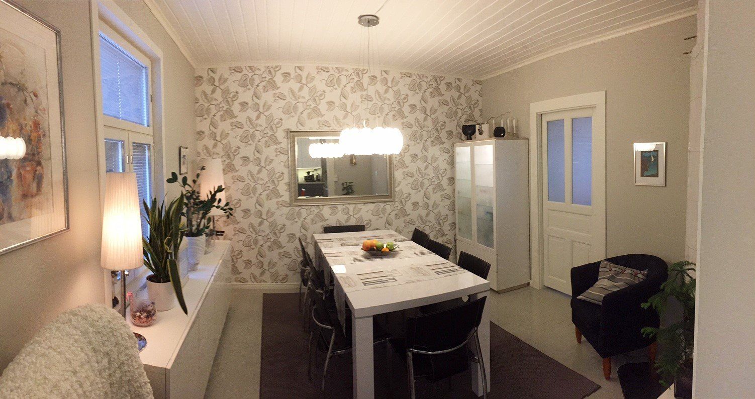 Tässä kodissa uudistettiin kaikki lattia-, seinä- ja kattopinnat sekä keittiö. Vanha lautalattia sai kauniin helmenharmaan sävyn ja maalatut ja tapetoidut seinäpinnat myötäilevät kauniisti lattian sävyjä. Katot maalattiin valkoisiksi. Myös osa tekstiileistä uudistettiin remontin myötä. Asunto sai raikkaan uuden ilmeen ja tyytyväiset asukkaat!