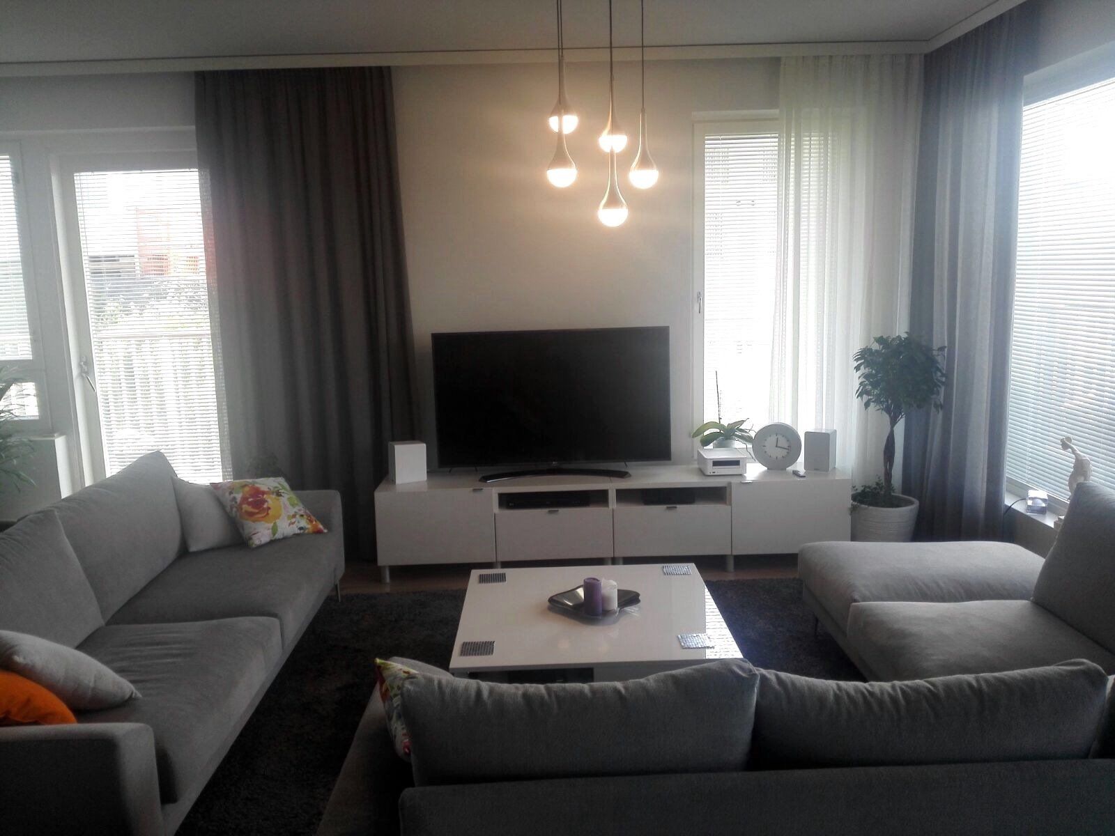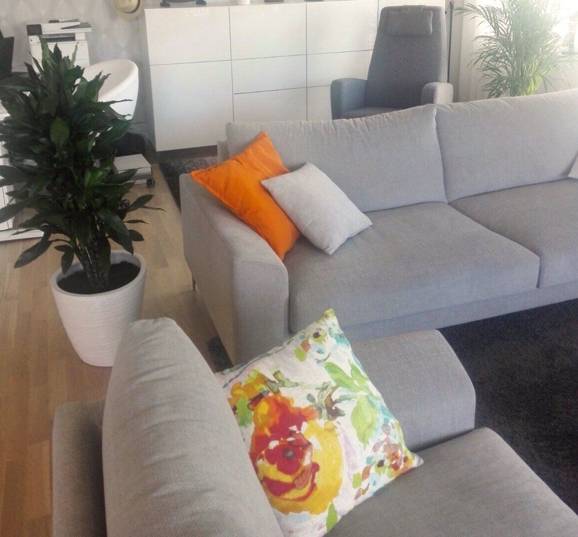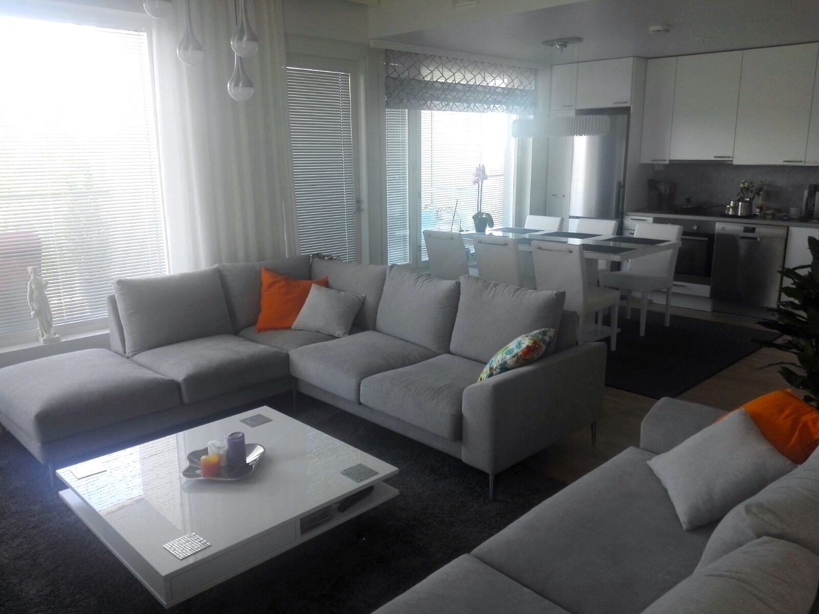 Tähän upouuteen kotiin tehtiin kalustus-, tekstiili- ja valaistussuunnitelma. Yleisilmeeksi valittiin rauhallinen harmaa, jota piristettiin raikkaan värisillä yksityiskohdilla kuten tyynyillä.