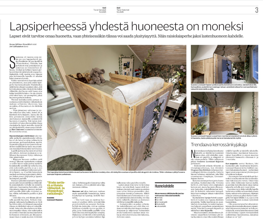 "Olemme todella tyytyväisiä Marin tekemään suunnitelmaan ja toteutukseen. Meillä yhteistyö toimi ja ajatusmaailma valittavien materiaalien, värien ja muiden asioiden suhteen oli hyvin samanhenkinen. Mariin voi luottaa ja hän kuuntelee asiakasta, tuoden myös rohkeasti omia näkemyksiä esille."